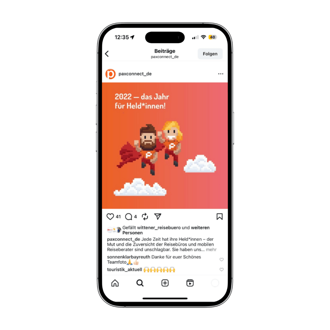 Approach: We began by analyzing the existing corporate design and the client’s requirements. Building on this, we developed a new design system that incorporated the logo’s framework and transformed the “Pax” and “Connect” elements into flexible containers that can be used for content and messaging. At the same time, the color palette was expanded and harmonized: Orange remained the central color, while cyan and green were toned down and supplemented with violet and yellow. Additionally, we developed the “heroes” as new key visuals to add emotional impact to the design. The results were presented in a presentation, feedback was incorporated during a revision round, and the final system was implemented—flexible, consistent, and usable across all media, including sales folders, advertisements, social media, news banners, and trade show booths.